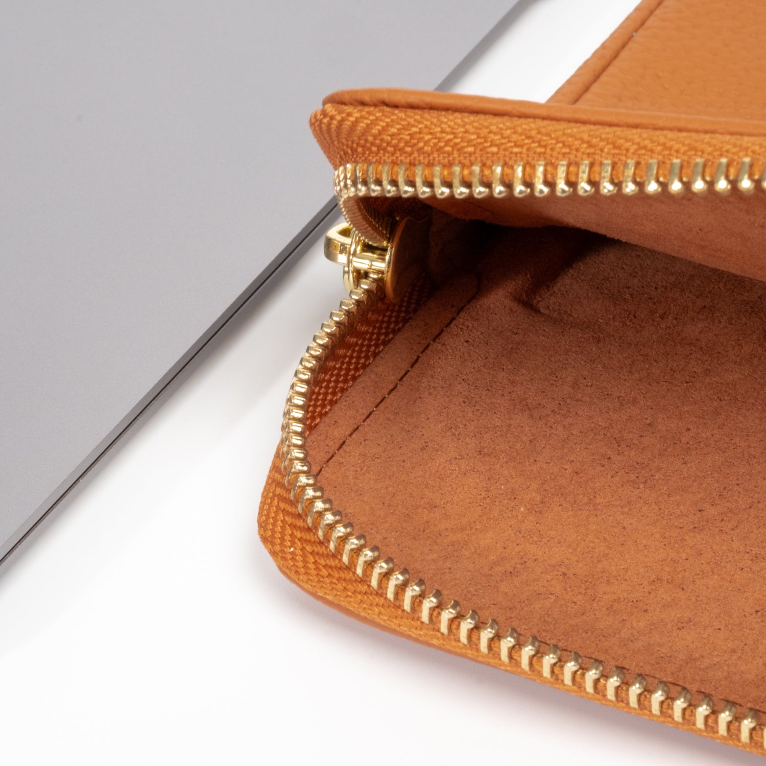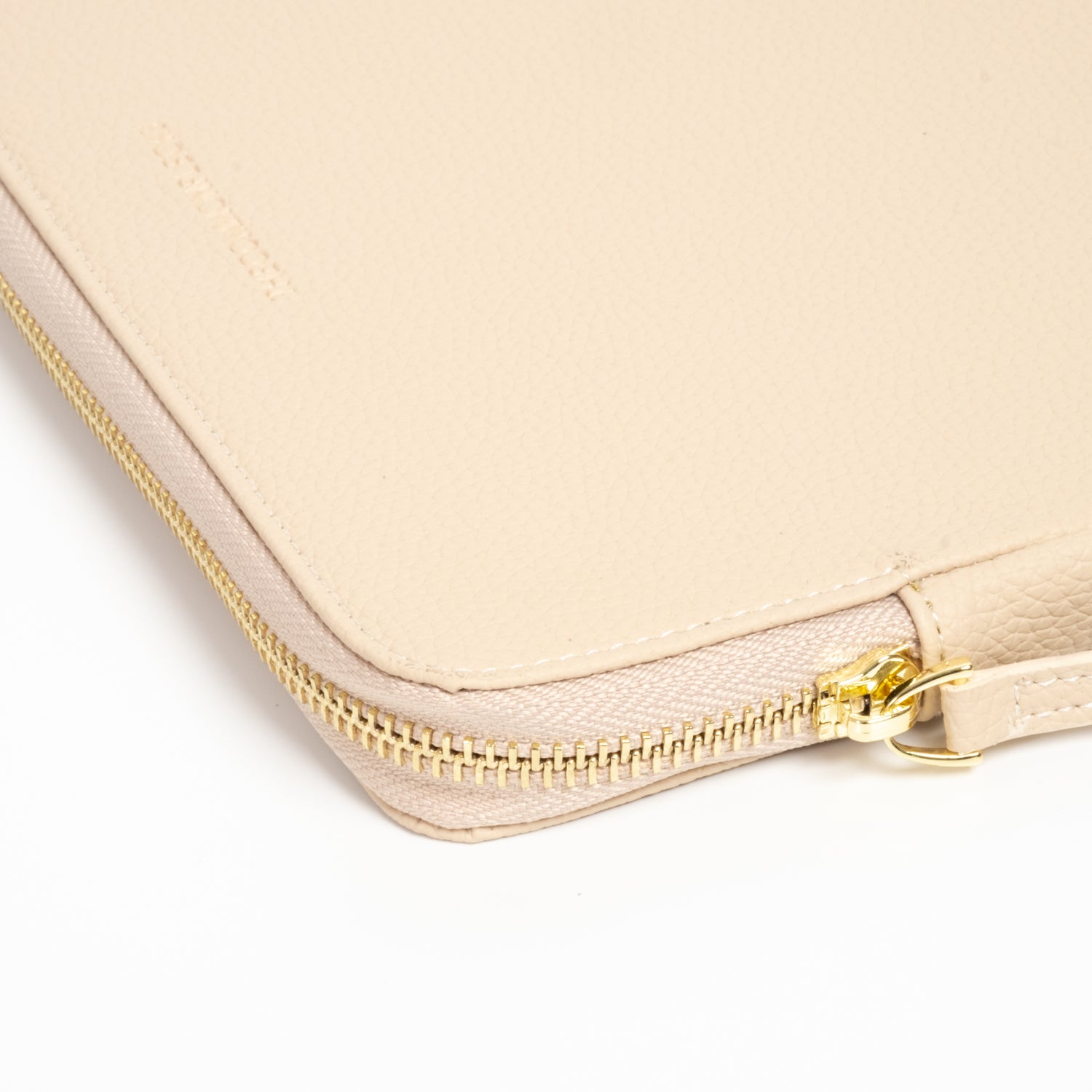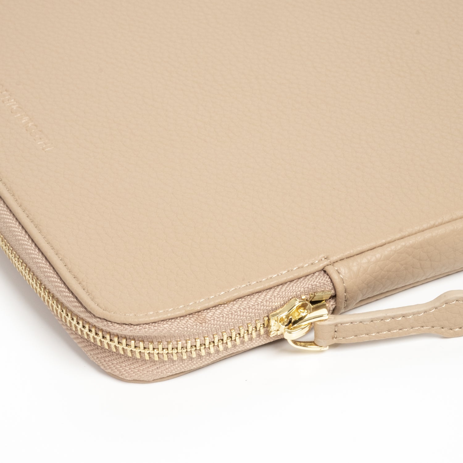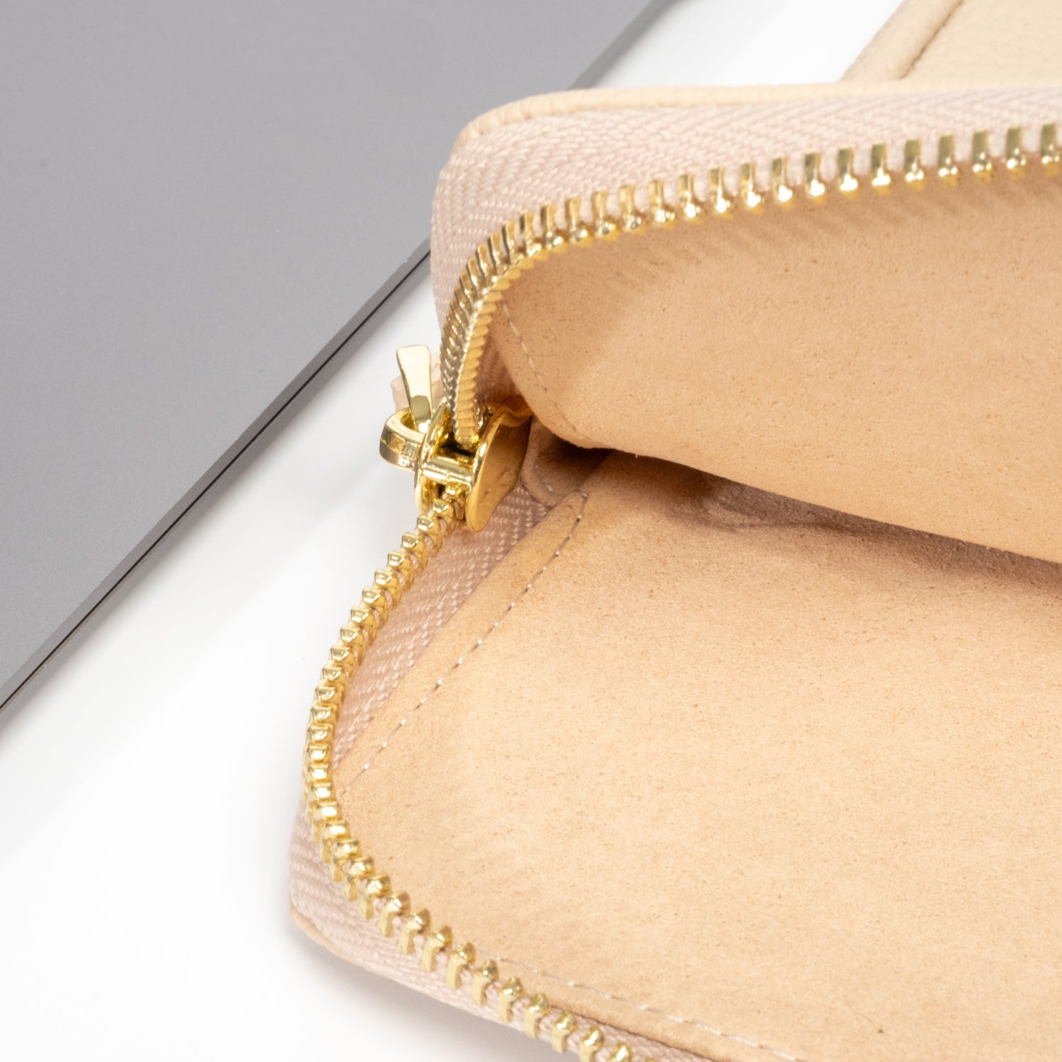 - Secure luxurious light gold hardware and padded leather zipper pull
