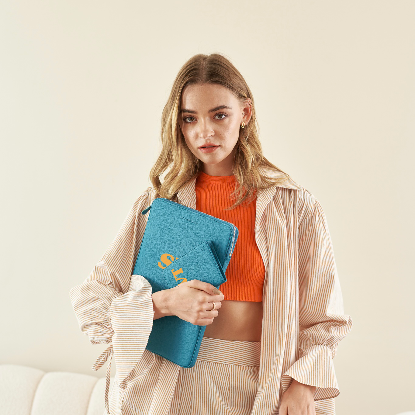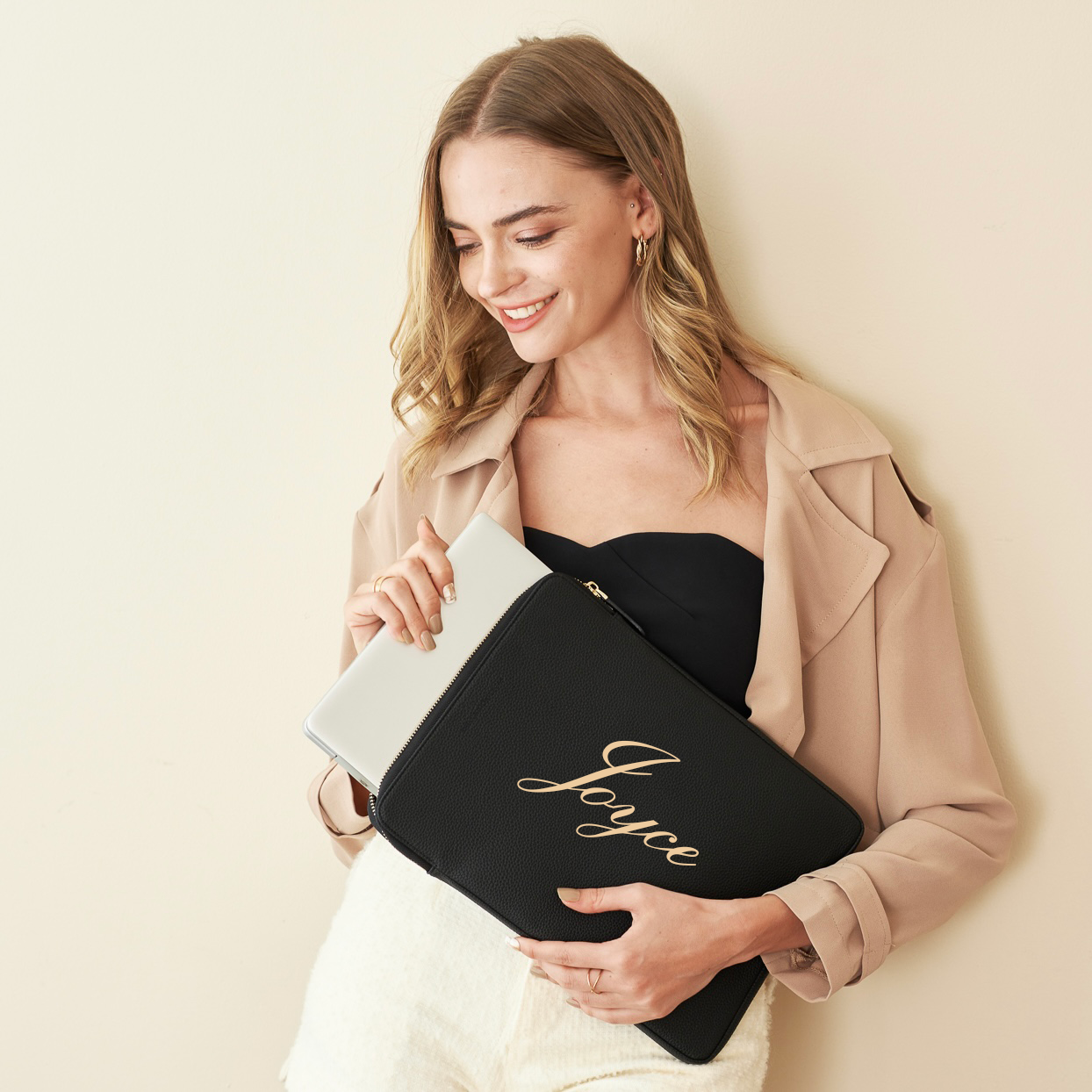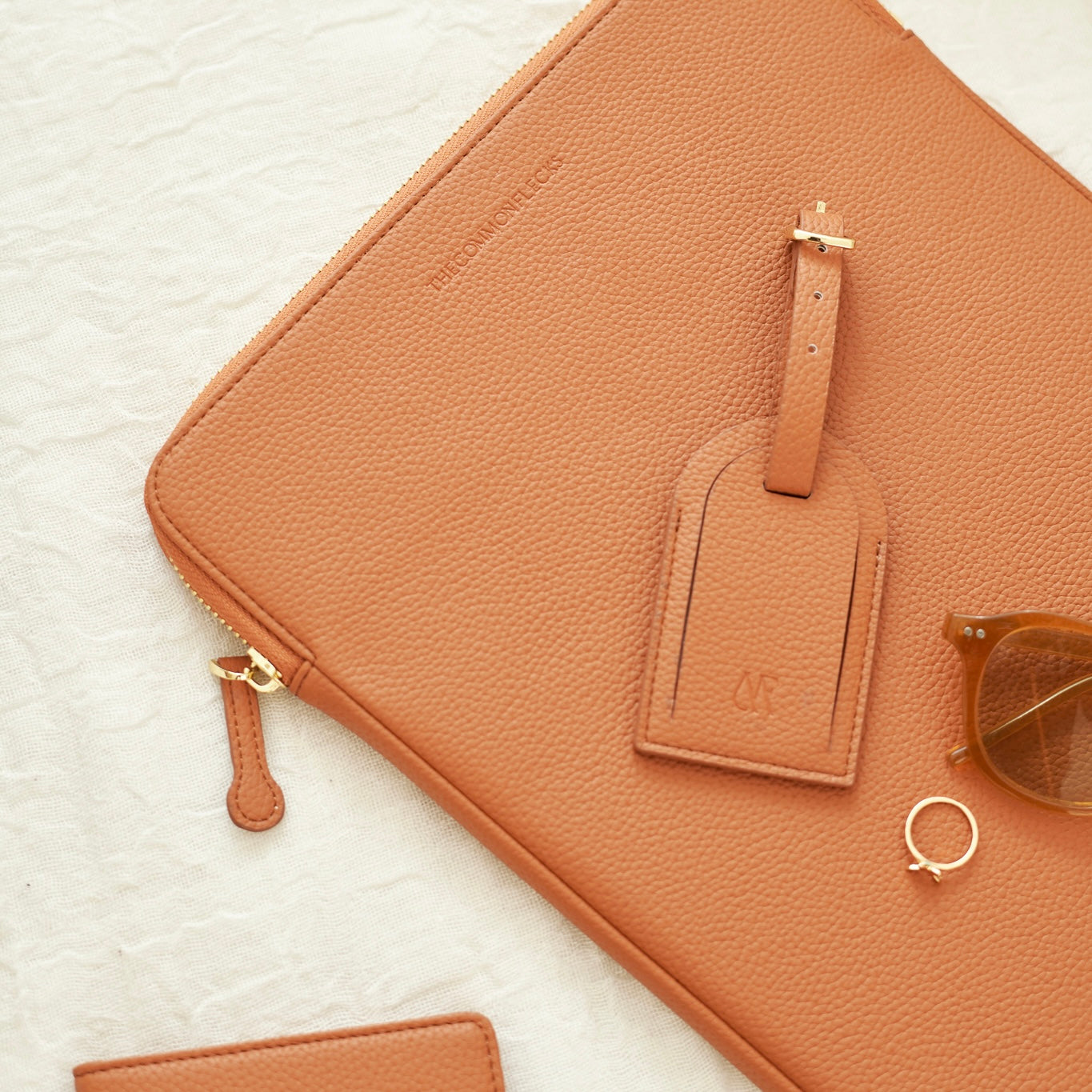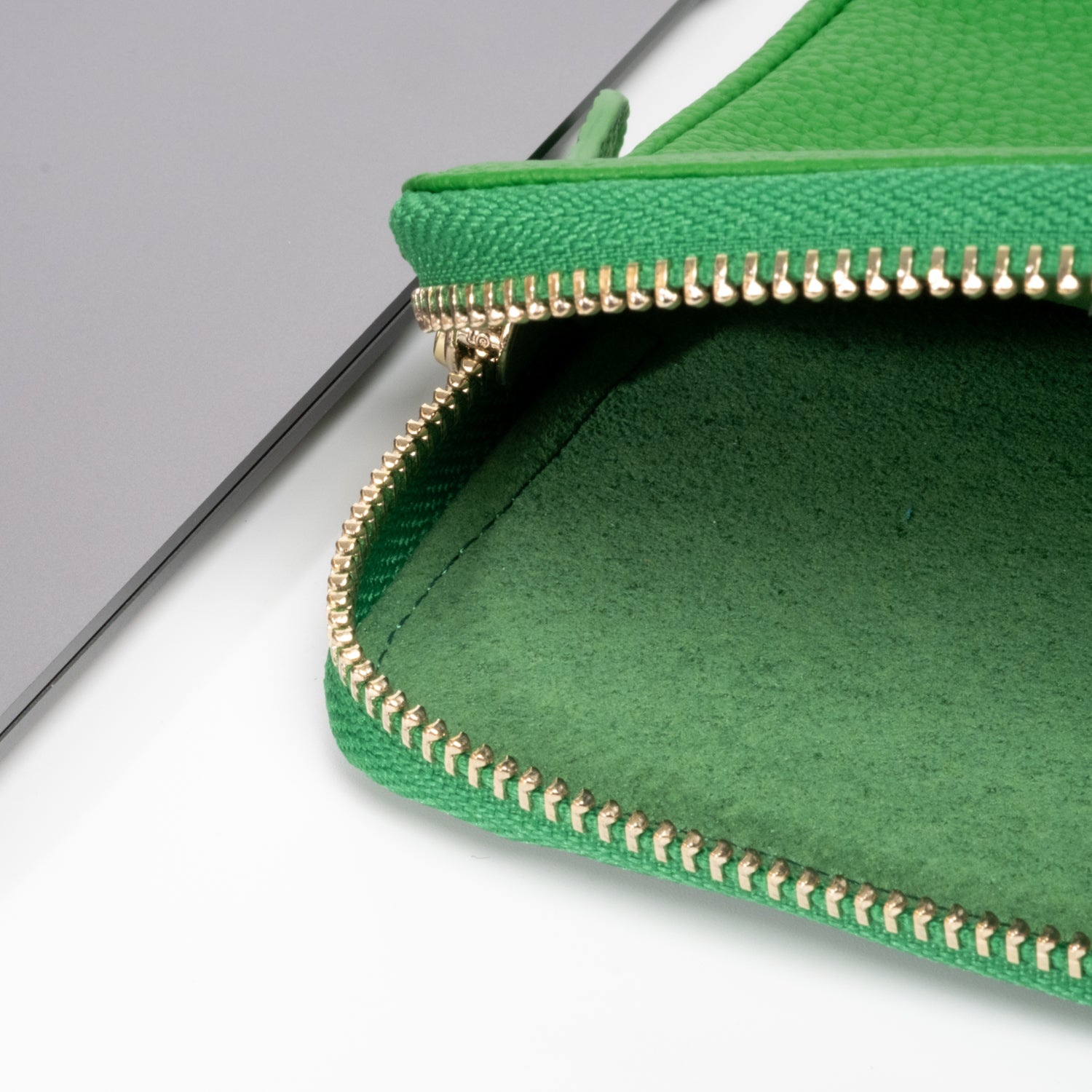 - Secure luxurious light gold hardware and padded leather zipper pull